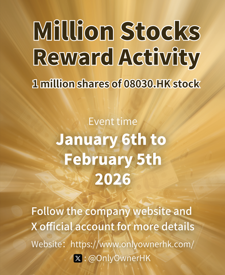 We are pleased to announce that we will be launching the " Million Stocks Reward Activity " from January 6th to February 5th, 2026, with the prize being "one million shares of 08030.HK stock *". Please follow our company website and X official account for more details. Website:https://www.onlyownerhk.com/ X Official Account: @OnlyOwnerHK *One million shares of 08030.HK stock value: HKD 11.69 million (calculated based on the closing price on December 22, 2025)